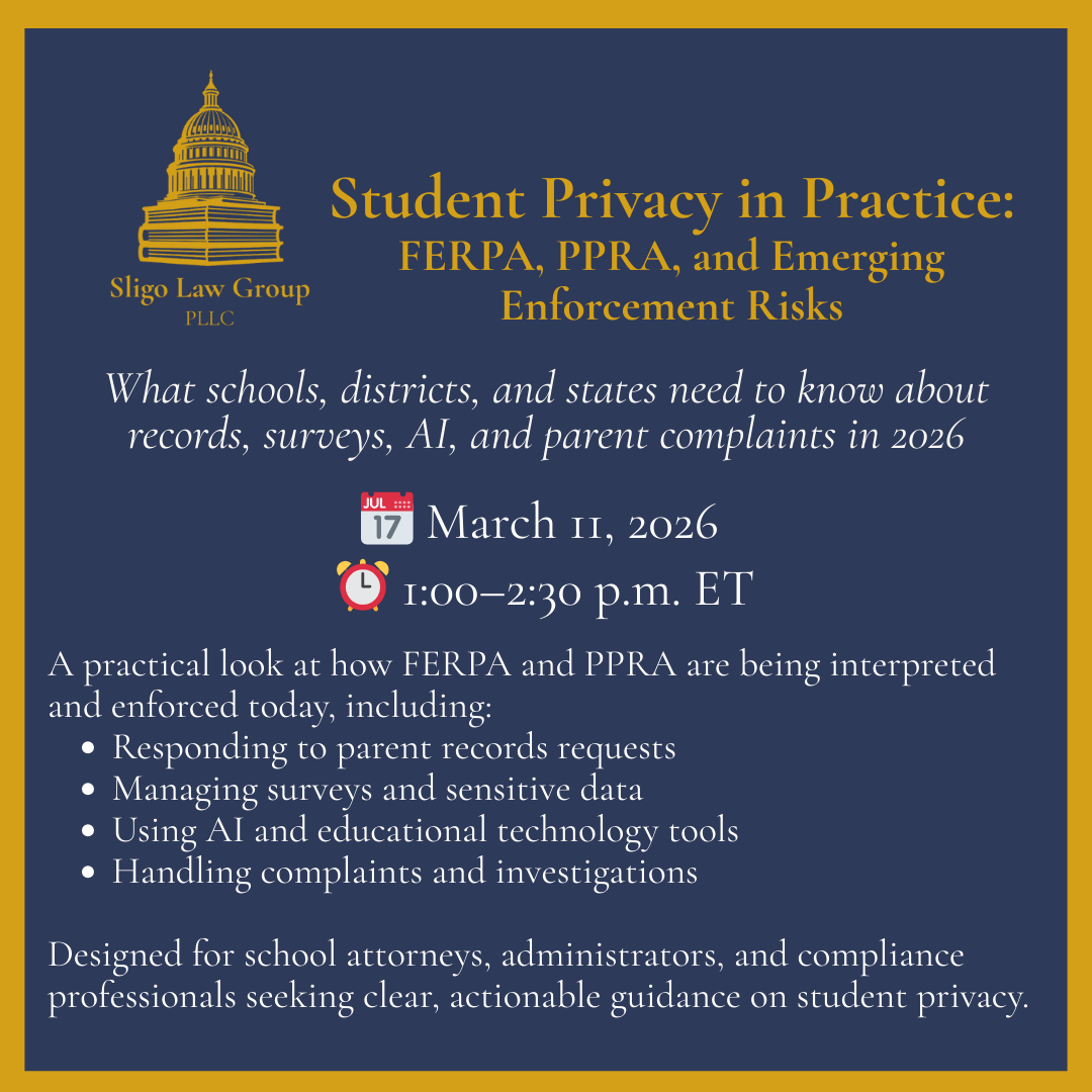 Note: By registering for or viewing events, you agree that Sligo Law Group may email you event-related information, follow-up materials, and occasional updates about federal education law topics. We will never sell, share, or disclose your email address to third parties. You may unsubscribe at any time.